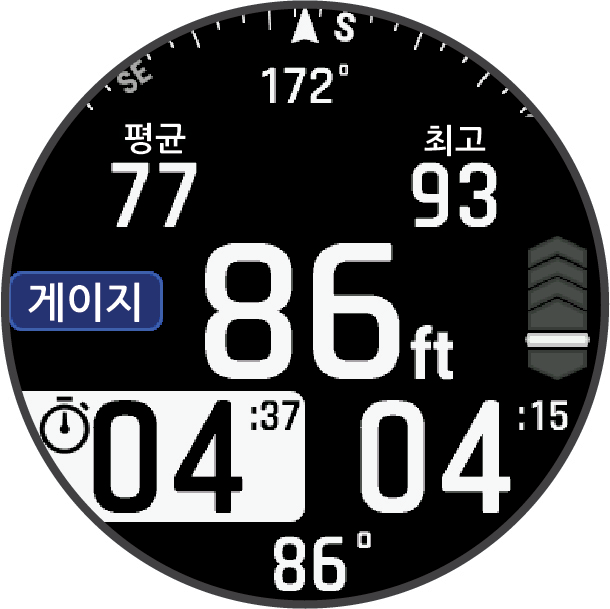 게이지 다이빙 모드의 주 데이터 화면은 현재/최대/평균 수심을 포함한 현재 다이빙 데이터와 스톱워치를 표시합니다(게이지 다이브 스톱워치 사용하기). DOWN을 눌러 하루 중 시간과 심박수를 포함한 추가 데이터를 훑어보거나 다이빙 나침반을 확인할 수 있습니다(다이빙 나침반을 사용하여 위치 탐색하기).