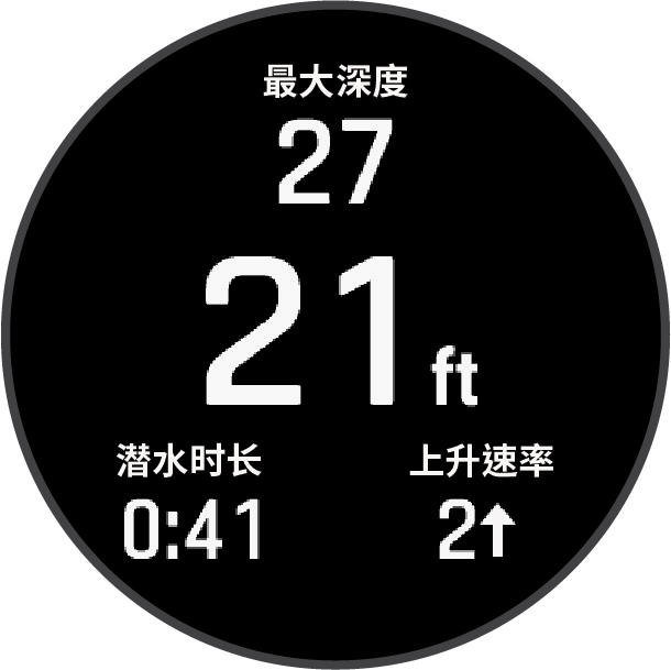 自由潜水/自由狩猎潜水数据页自由潜水或自由潜水捕猎潜水模式的潜水页面显示目前潜水的资讯,包含经过时间、目前最大深度及上升下潜速率。在水面休息时间,您可以按 DOWN 键浏览其他资料,包括上次潜水深度和时间、查看地图画面,以及使用秒表(使用基本潜水秒表)。主页潜水潜水数据页面自由潜水/自由狩猎潜水数据页