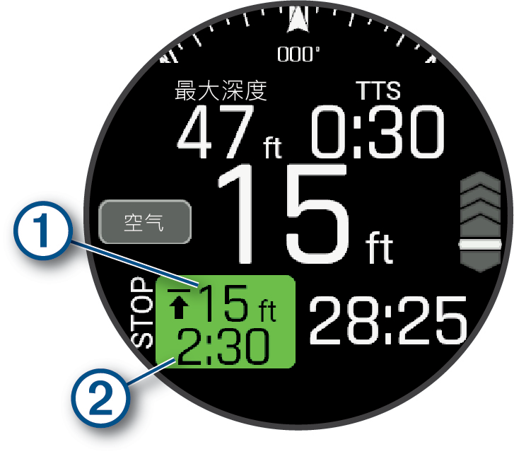 - 维持在安全停留深处上限的2米范围内,直到安全停留计时器归零。