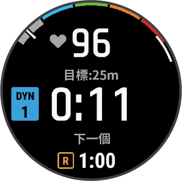 泳池平潛資料畫面泳池平潛模式的潛水中畫面會顯示當次潛水的相關資訊,包括您的當下心率、目標距離、訓練組數、經過時間,以及預覽訓練活動的下一步驟。在水面休息期間,您可以按下 DOWN 鍵檢視您前次潛水的相關資訊。您可以按下 START 鍵停止、變更或預覽當下訓練活動或存取活動設定。首頁潛水潛水設定泳池平潛資料畫面