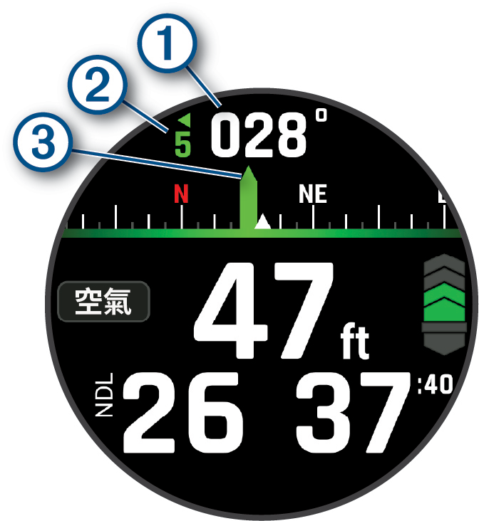 - 在 單一氣體、多氣體、CCR,或 儀錶 潛水期間,捲動至潛水電子羅盤。