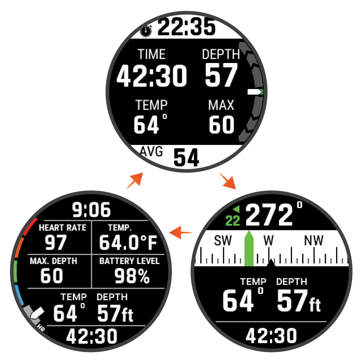 Dive stopwatch: Displays the bottom time stopwatch and your rate of ascent or decent (Using the Dive Stopwatch).