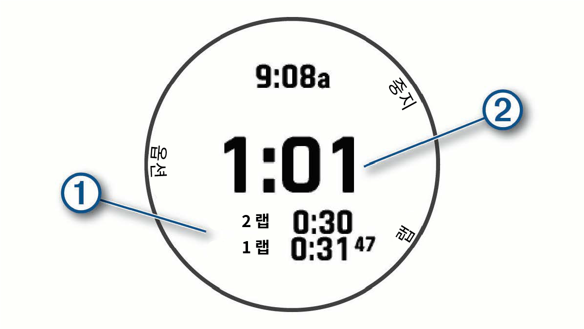 - 랩 타이머①를 다시 시작하려면 LAP을 누릅니다.