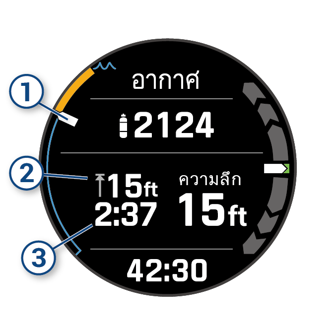 หมายเหตุ: หากคุณดำขึ้นไปสูงกว่า 3 ม. (8 ฟุต) เหนือความลึกเพดานหยุดเพื่อความปลอดภัย ตัวจับเวลาหยุดเพื่อความปลอดภัยจะหยุดชั่วคราวและอุปกรณ์จะแจ้งเตือนให้คุณดำลงมาต่ำกว่าความลึกของเพดาน หากคุณดำลงมาต่ำกว่า 11 ม. (35 ฟุต) ตัวจับเวลาหยุดเพื่อความปลอดภัยจะรีเซ็ต