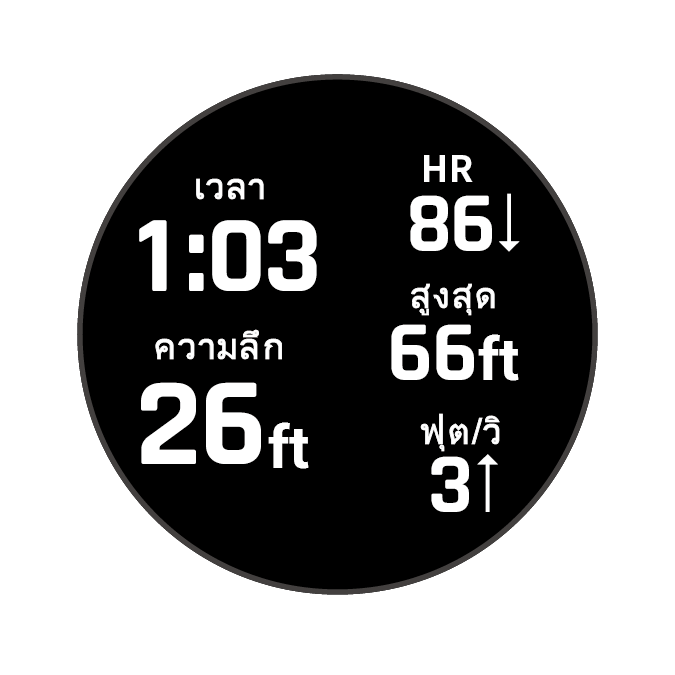 หน้าจอในขณะการดำน้ำ: แสดงข้อมูลเกี่ยวกับการดำน้ำปัจจุบัน รวมถึงเวลาที่ผ่านไป ความลึกปัจจุบันและสูงสุด ข้อมูลอัตราการเต้นของหัวใจและอัตราการดำขึ้นหรือดำลง