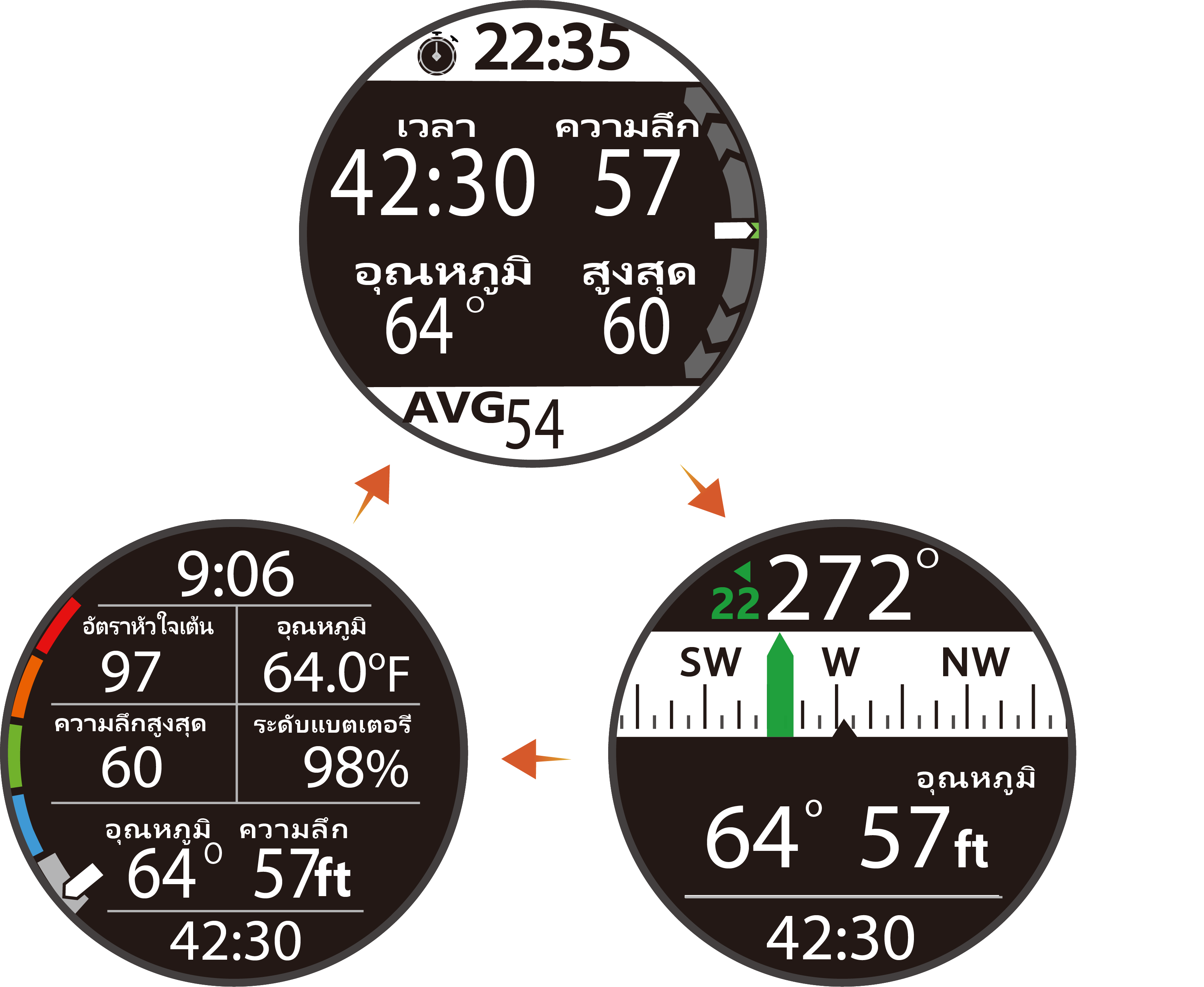 นาฬิกาจับเวลาดำน้ำ: แสดงนาฬิกาจับเวลาเมื่ออยู่ใต้น้ำ; ความลึกปัจจุบัน สูงสุด และเฉลี่ย และอัตราการดำขึ้นหรือดำลงของคุณ (การใช้นาฬิกาจับเวลาการดำน้ำ)