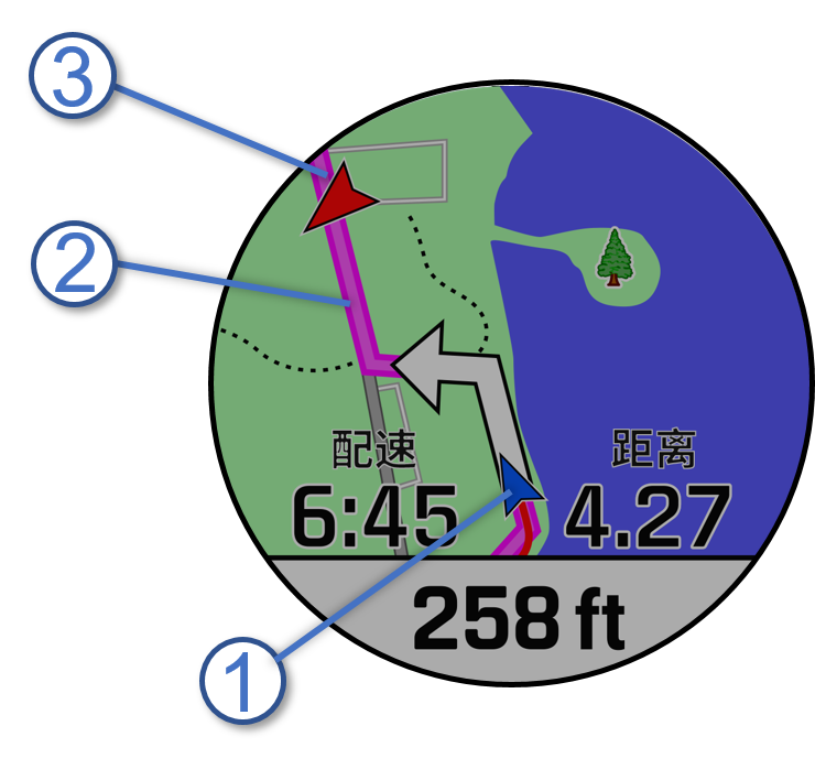 导航至起点您可以导航回路线起点或沿迹返航,但此功能仅适用于 GPS 有开启的活动。 活动中按下 STOP 键。 选择 回到起点,再选择一个选项:选择 航迹返航 沿迹返航至起点。如果设备无支持的地图信息或是直接使用航线,请选择 航线 以直线导航回到活动的起点。如果不使用直线导航,请选择 航线,以转弯提示返回活动的起点。 您的目前位置 ①、航迹 ② 与目的地 ③ 均显示在地图上。查看路线方向主页导航导航至起点