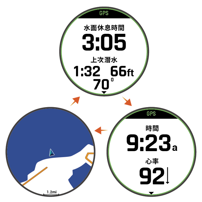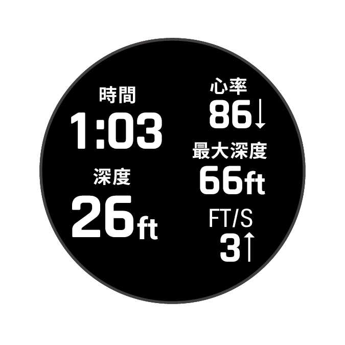 自由潛水及自由潛水捕獵資料頁面水面休息頁面:顯示現在水面休息時間,以及上一次自由潛水的經過時間、最大深度及溫度資訊。時間頁面:顯示時間及您的心率資訊。地圖:在地圖上顯示您目前位置(使用地圖潛水)。潛水頁面:顯示目前潛水的資訊,包含經過時間、現在及最大深度、心率資訊及上升下潛速率。首頁潛水潛水資料頁面自由潛水及自由潛水捕獵資料頁面