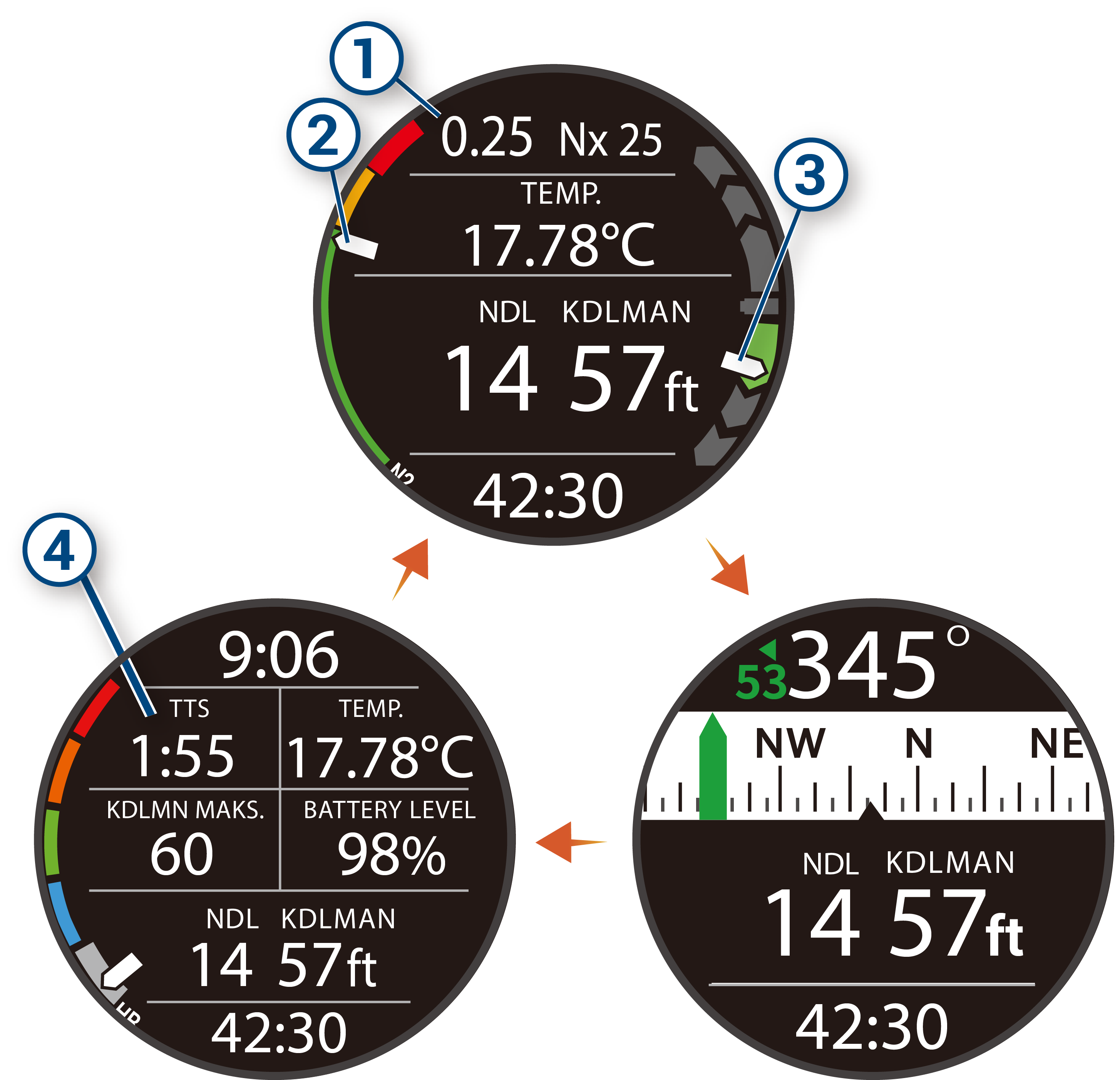 Layar data utama: Menampilkan data penyelaman utama, termasuk gas pernapasan dan laju naik atau turun Anda.