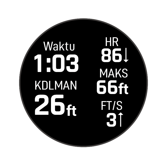 Layar saat menyelam: Menampilkan informasi tentang penyelaman terkini, termasuk waktu yang telah berlalu, kedalaman terkini dan maksimal, data denyut jantung, serta laju naik atau turun.