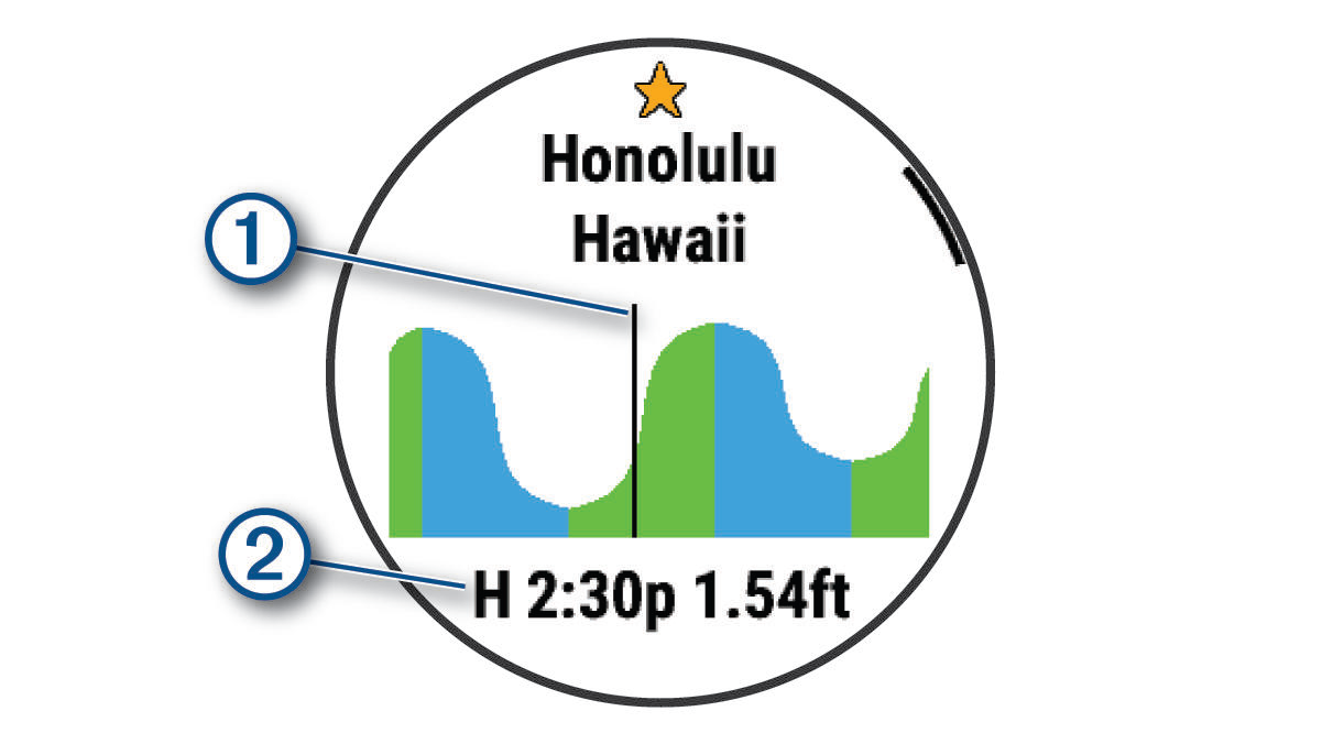 현재 날짜에 대한 24 시간 조수 차트가 현재 조수 높이①와 다음 조수 정보②와 함께 표시됩니다.