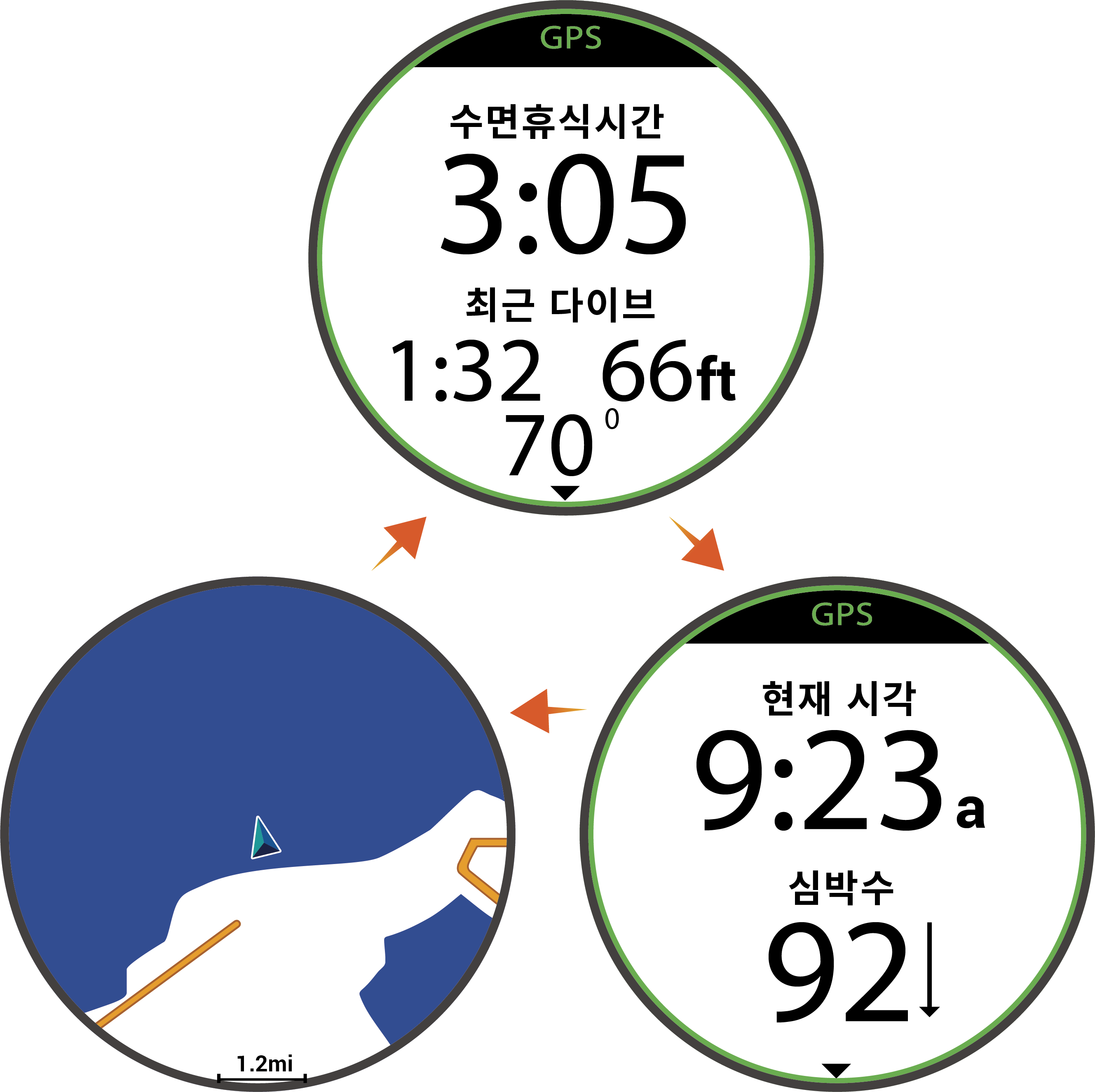 지도: 지도 상에 현재 위치를 표시합니다 (8 페이지, 지도를 사용하여 다이빙하기)