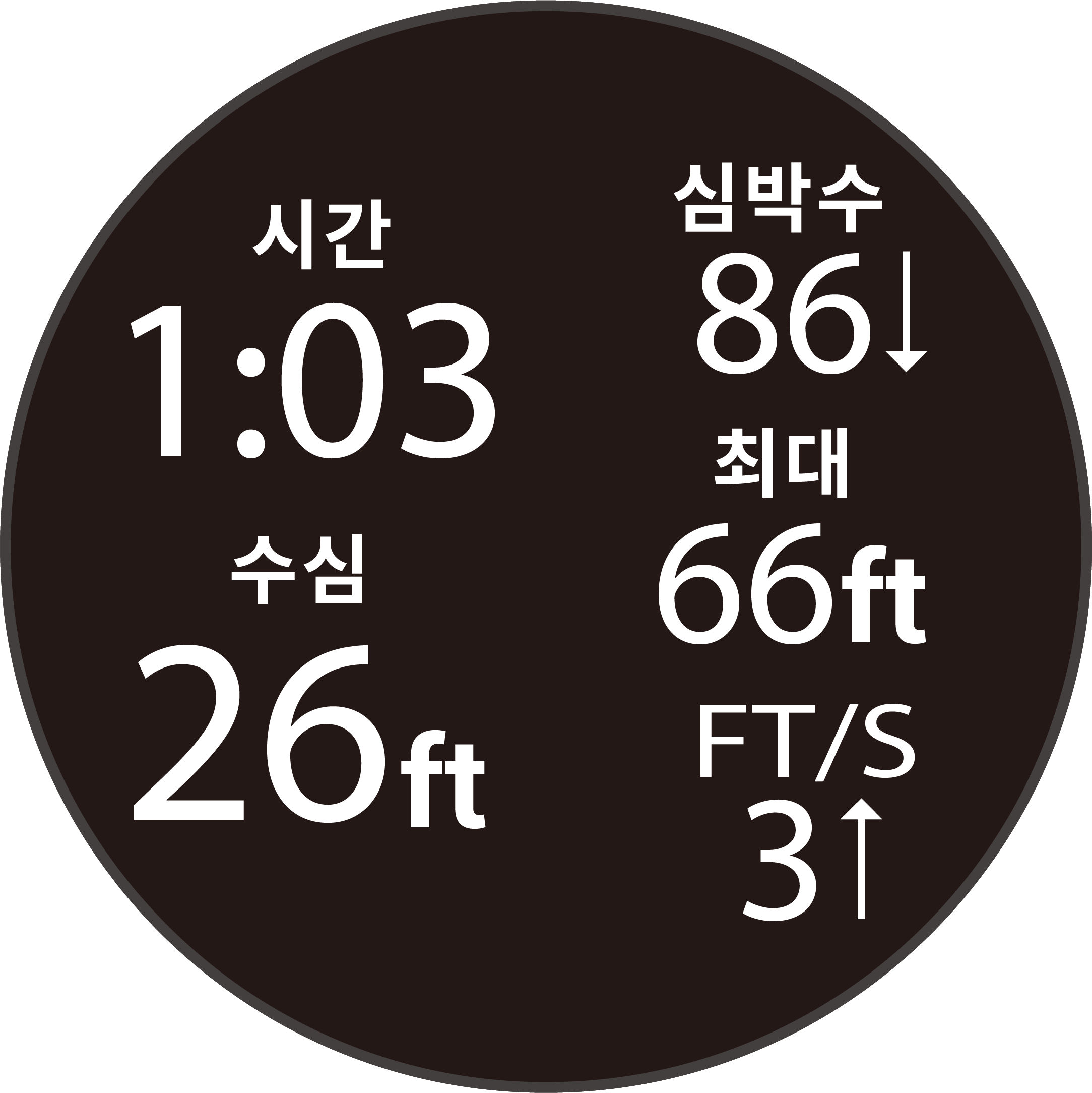 수중 모드 화면: 경과시간, 현재 및 최대 수심, 심박수 데이터, 상승 및 하강 속도를 포함한 현재 다이브의 정보를 표시합니다.