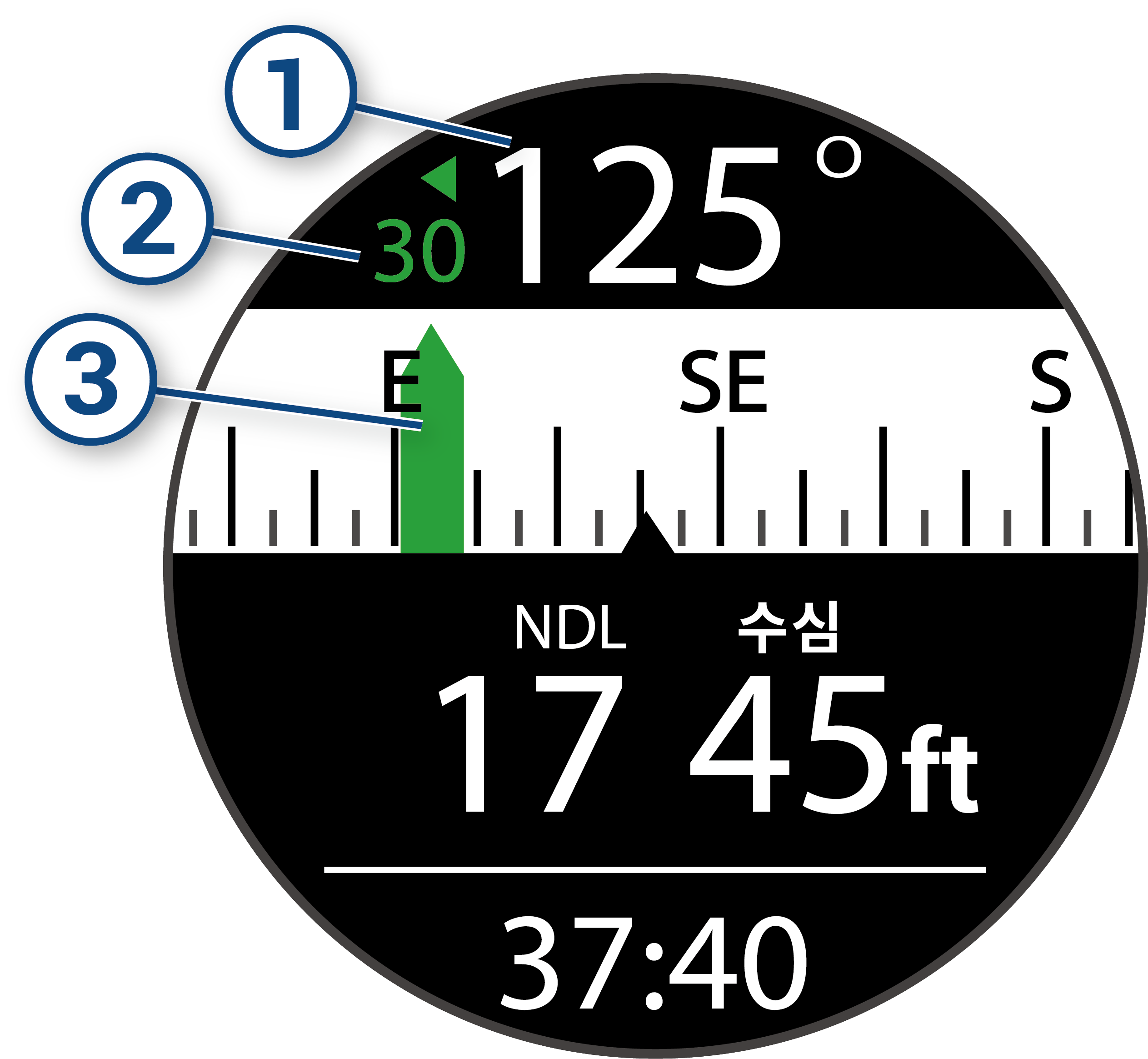 나침반은 설정 방향 ③으로부터의 편차 ②를 표시합니다.