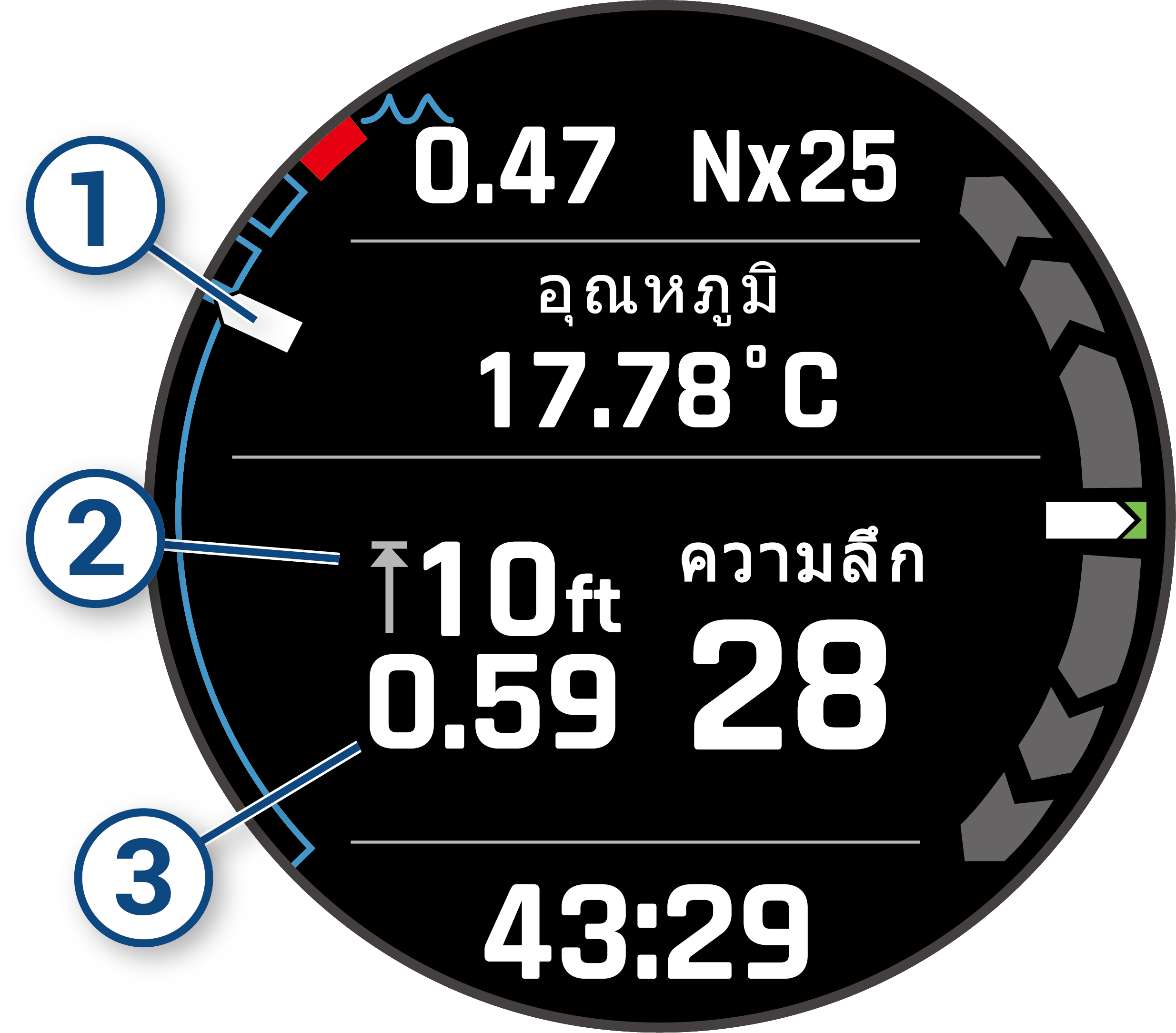 - เมื่อคุณใช้เวลาเกินขีดจำกัดไม่ทำการลดความกดอากาศ (NDL) ให้เริ่มดำขึ้น