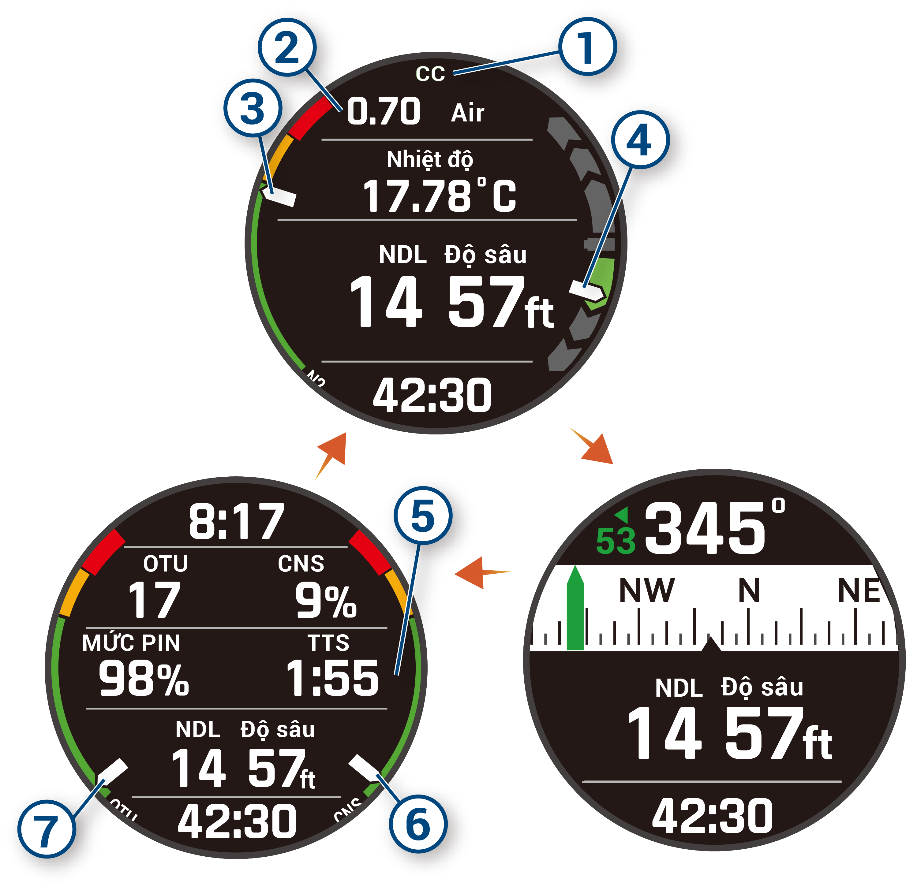 Màn hình dữ liệu chính: Hiển thị dữ liệu lặn chính, bao gồm khí thở của bạn và tốc độ ngoi lên hoặc lặn lên.