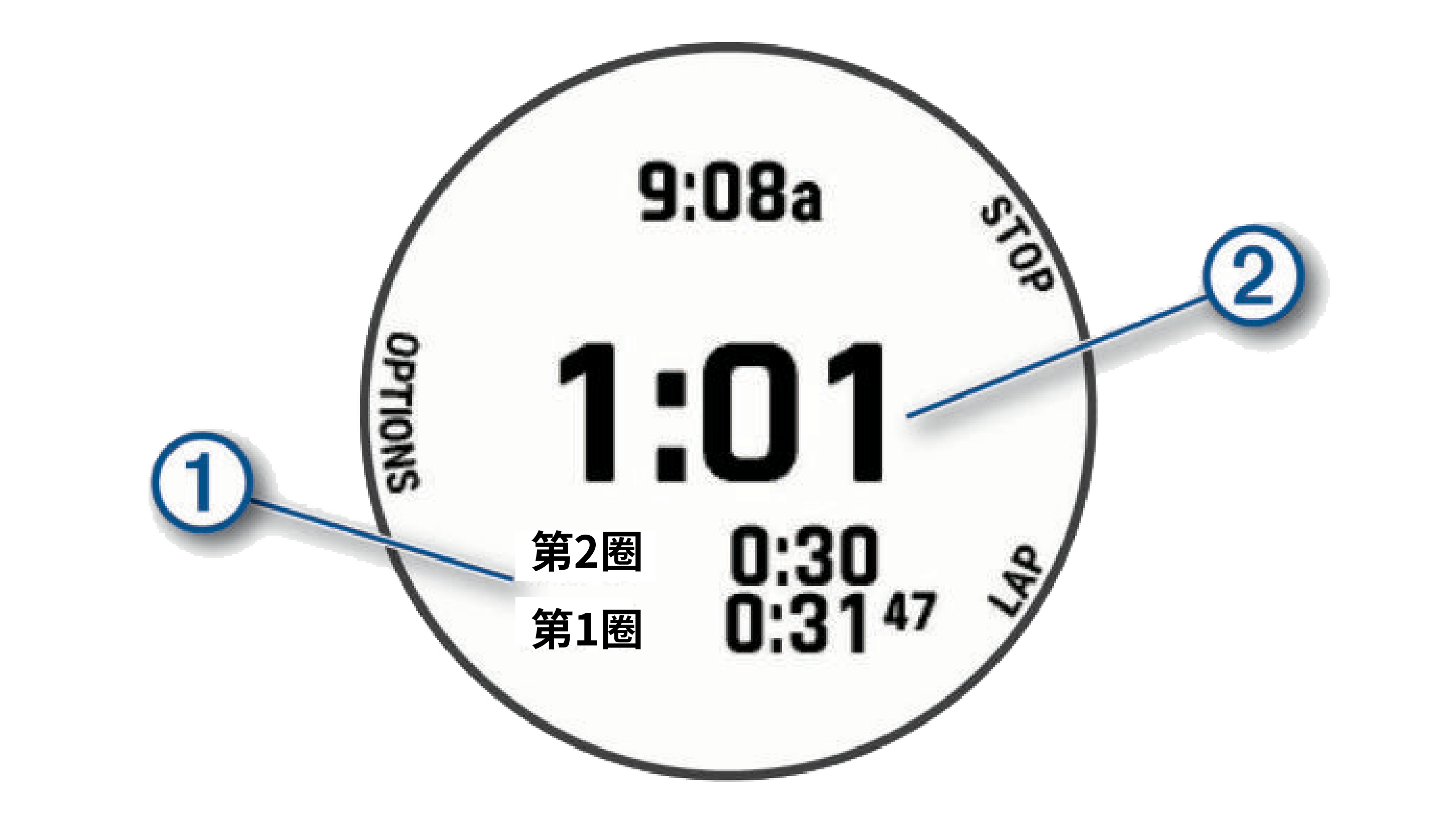 - 按 LAP 键可以重新开启圈计时 ①。