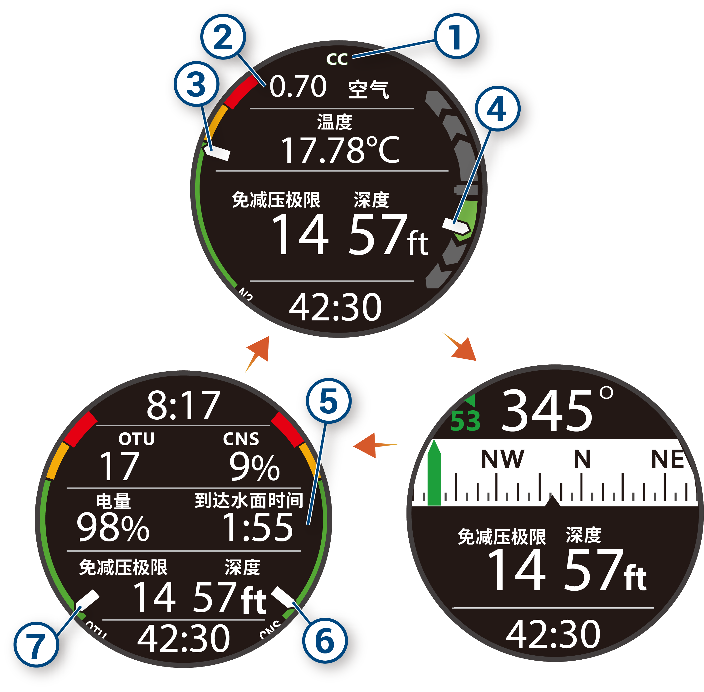 潜水罗盘:查看电子罗盘以及设置航向,帮助潜水员在水下导航(使用潜水电子罗盘导航,第6页)。