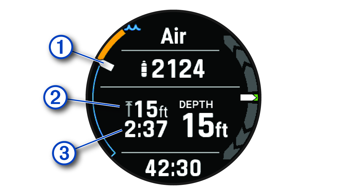 - When you pass the no-decompression limit (NDL) time or perform a safety stop, the first data screen shows ascent information.