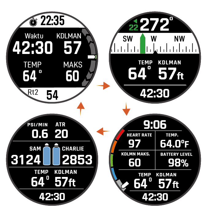 Stopwatch selam: Menampilkan stopwatch waktu ketika berada di bawah; kedalaman terkini, maksimal, dan rata-rata; serta laju naik atau turun Anda ().