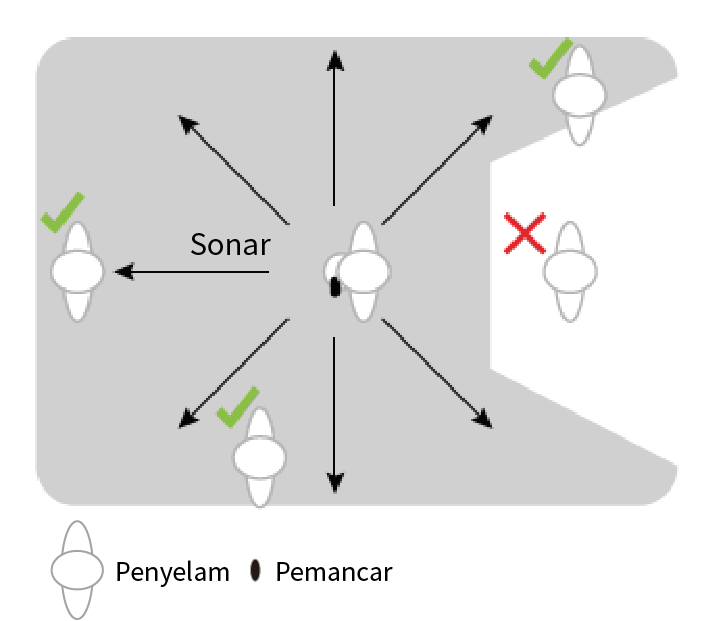 Pemancar berkomunikasi secara nirkabel dengan dive computer Anda yang kompatibel. Di atas permukaan, perangkat menggunakan teknologi ANT. Di bawah permukaan, perangkat menggunakan sinyal sonar. Tubuh, pakaian kering, dan peralatan selam Anda dapat menghalangi sinyal, terutama di bawah permukaan. Untuk penerimaan sinyal terbaik, semua pemancar di grup Anda harus memiliki garis pandang yang jelas ke dive computer. Untuk mencegah sinyal terhalang tubuh atau peralatan Anda, ikuti tips-tips berikut ini: