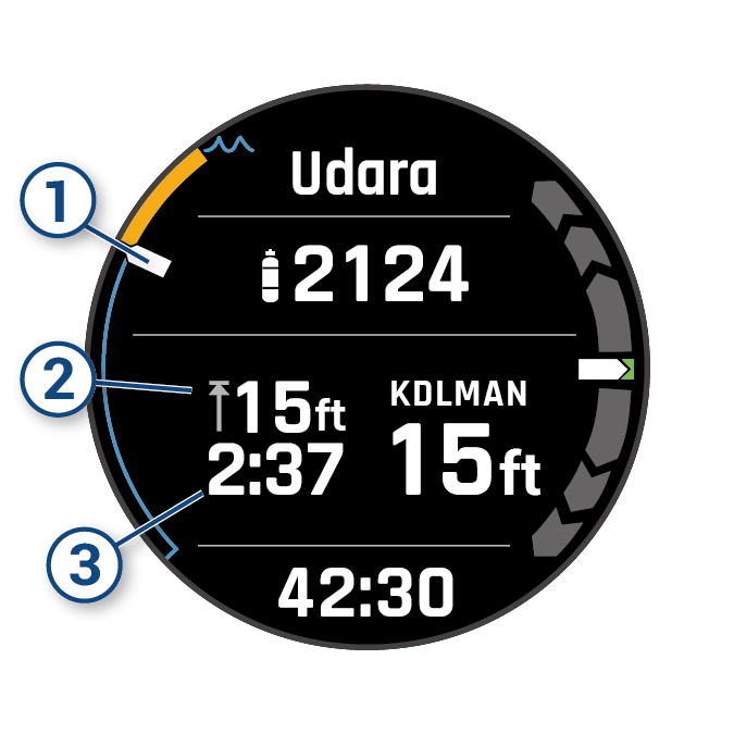 Timer perhentian aman. Saat Anda berada dalam 1 m dari batas atas kedalaman, timer mulai menghitung mundur. |