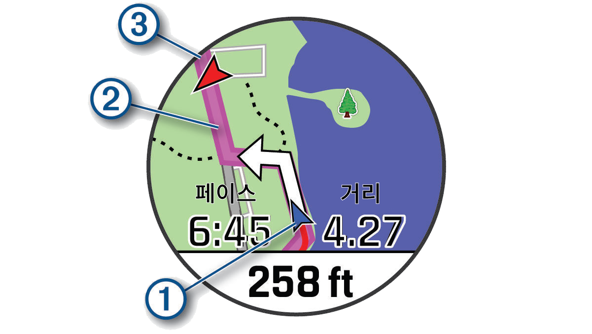 현재의 위치 ①, 진행할 트랙 ②, 목적지 ③가 지도 상에 나타납니다.