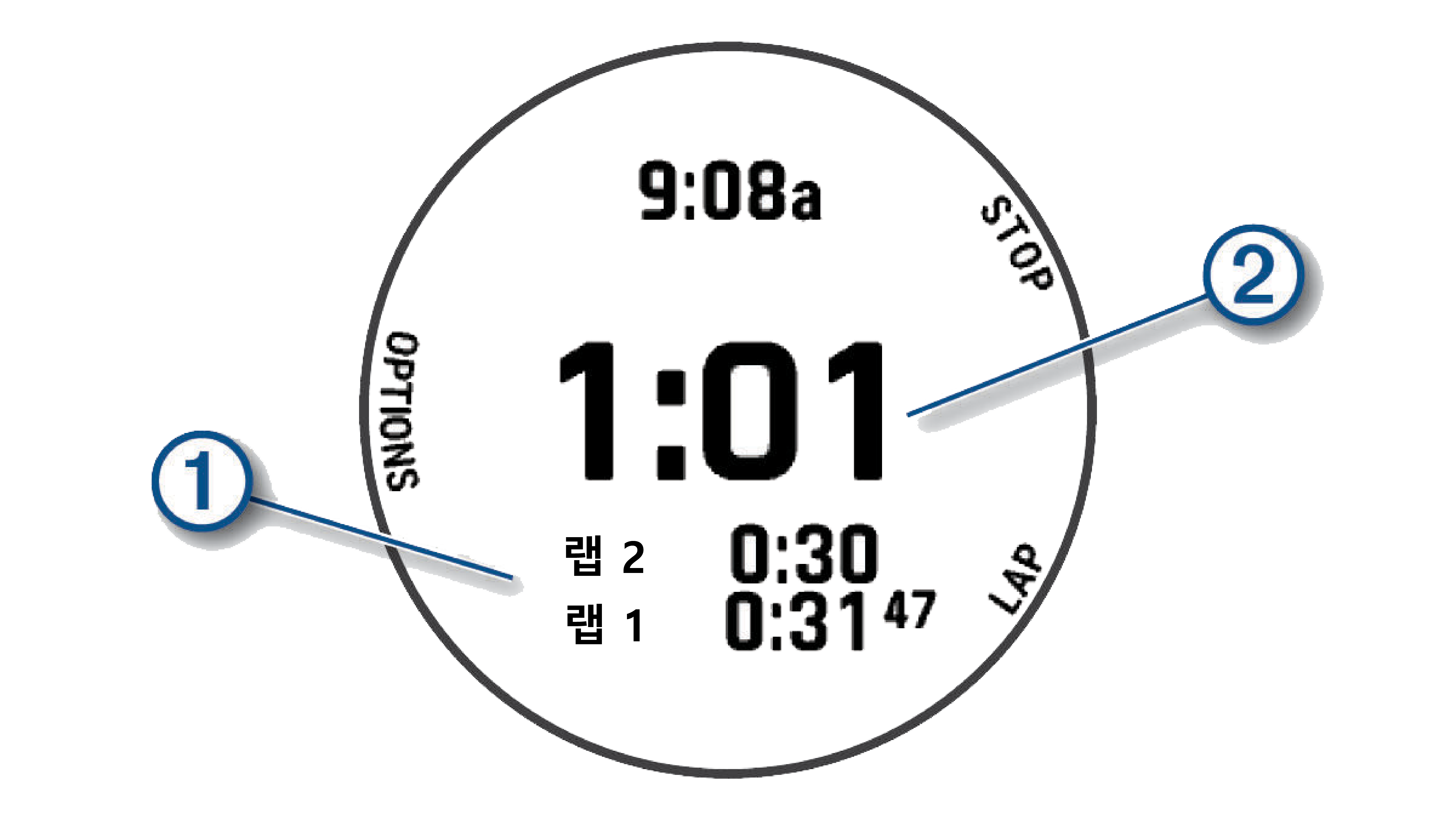 - 랩 타이머①를 다시 시작하려면 LAP을 누릅니다.