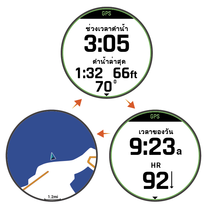 หน้าจอในขณะการดำน้ำ: แสดงข้อมูลเกี่ยวกับการดำน้ำปัจจุบัน รวมถึงเวลาที่ผ่านไป ความลึกปัจจุบันและสูงสุด ข้อมูลอัตราการเต้นของหัวใจและอัตราการดำขึ้นหรือดำลง
