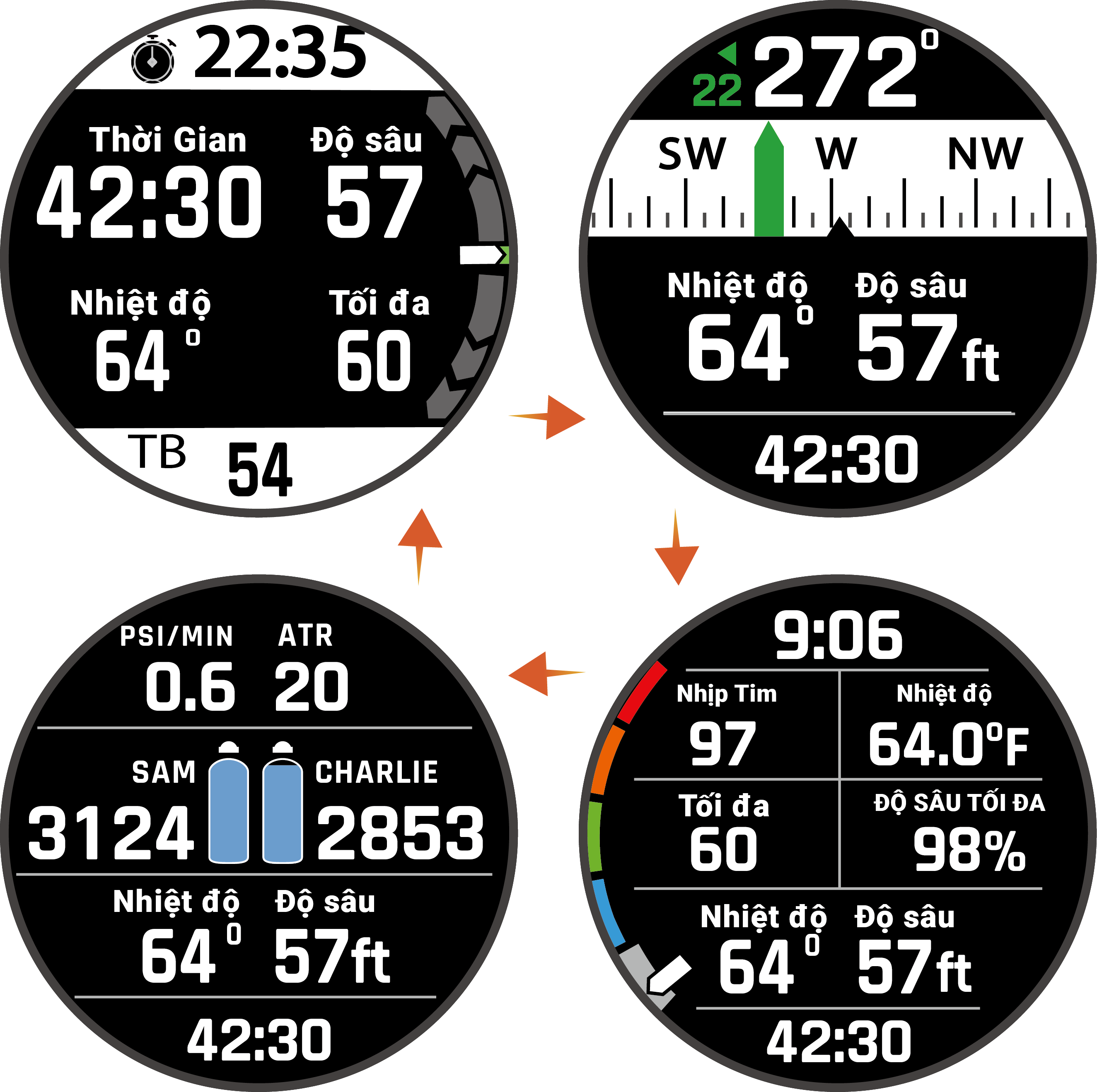 Màn hình dữ liệu có thể tùy chỉnh: Hiển thị dữ liệu lặn bổ sung và thông tin sinh lý, bao gồm thời gian trong ngày, mức pin và nhịp tim của bạn. Bạn có thể chỉnh sửa đồng hồ đo và năm trường dữ liệu đầu tiên ().