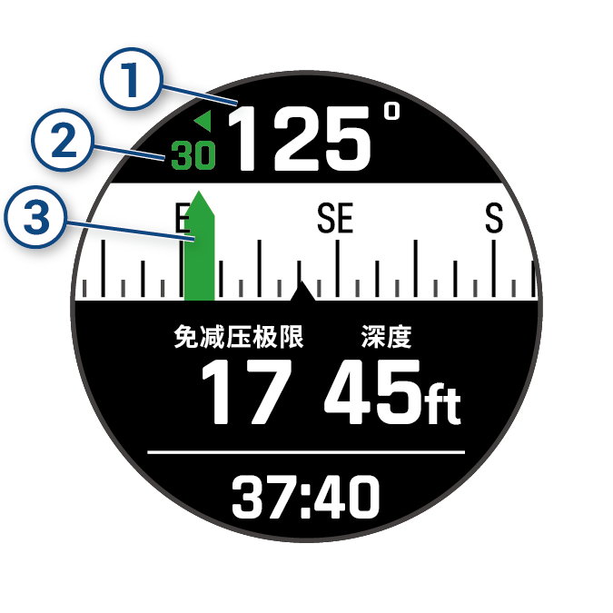 使用潜水电子罗盘导航 在单一气体,混合气体,CCR以及仪表潜水过程中,翻页至潜水罗盘页。电子罗盘会显示您的定向航向 ①➀。 选取 START 以设置航向。电子罗盘会显示目前与所设航向 ③ 的偏差 ②。 长按 START,然后选择以下选项。要重设航向,选择 重置航向。要 180 度改变航向,选择 旋转180度。注意:电子罗盘以红色标记指示逆行航向。要设置 90 度航向左方或右方,选择设为 左转90度 或设为 右转90度。要清除航向,选择清除航向。 主页潜水开始潜水使用潜水电子罗盘导航
