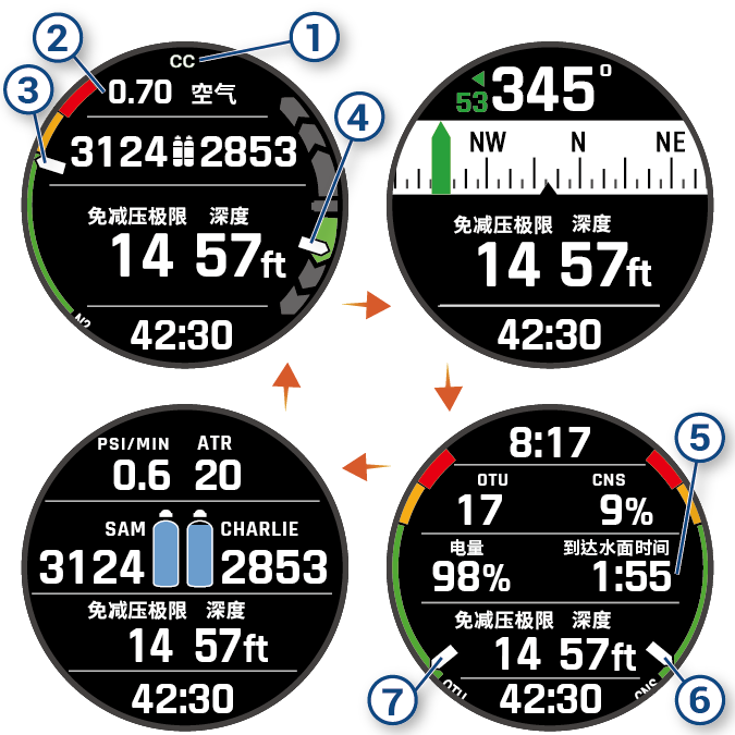 潜水罗盘:查看电子罗盘以及设置航向,帮助潜水员在水下导航(使用潜水电子罗盘导航,第9页)。