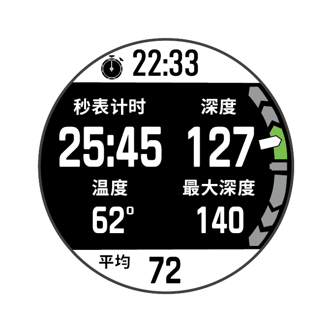 使用潜水秒表提示:你可以在任意气体潜水页面中添加秒表(自定义数据页面,第43页)。 开始 仪表潜水。 翻页至秒表页面。 选择 START > 重置平均深度。可以将平均深度设置为当前深度。 选择 START,选择 开启秒表。 选择一个选项:要停止使用码表,选择 START,选择 停止秒表。要重新启动码表,选择 START,选择 重置秒表。 主页潜水开始潜水使用潜水秒表