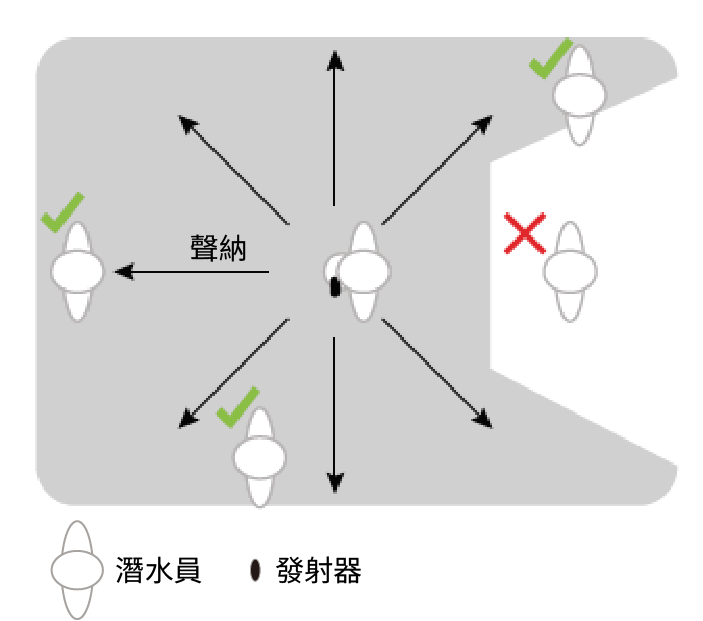 發射器可與相容的潛水電腦錶進行無線傳輸。在水面上,可使用ANT技術傳輸;在水面下,可透過聲納訊號傳輸。您的身體、潛水衣和潛水裝備可能會阻擋訊號的傳送,特別是在水中使用時。為了獲取最佳接收效果,潛水團隊中的所有發射器都應與潛水電腦錶保持在清晰的視線範圍內。為了防止身體或設備阻擋訊號,請遵循以下提示。