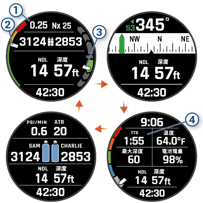潛水羅盤:您可以檢視羅盤和設定一個定向方位以協助水下導航(使用潛水電子羅盤導航)。