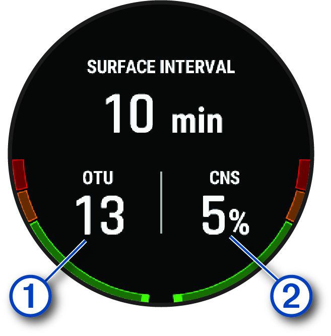 - Press START to view your current oxygen toxicity units (OTU) and central nervous system (CNS) percentage.
