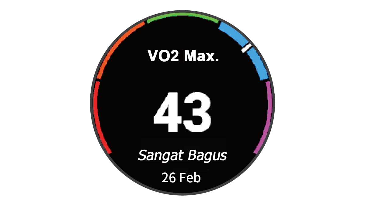 Perkiraan VO2 max. Anda muncul sebagai angka, deskripsi, dan posisi pada indeks warna di perangkat. Anda dapat melihat detail tambahan tentang perkiraan VO2 max. di akun Garmin Connect Anda, seperti penilaian umur dan jenis kelamin Anda.