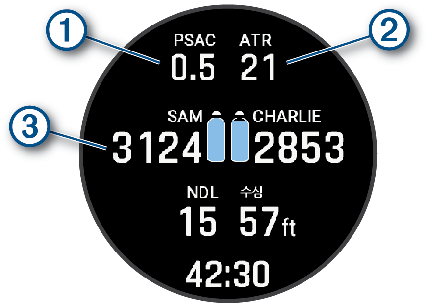 팁: 다이빙 데이터 화면을 사용자 설정하여 트랜스시버와 다이버 대시보드 데이터를 전용 데이터 화면에 표시할 수 있습니다(데이터 화면 사용자 설정하기).