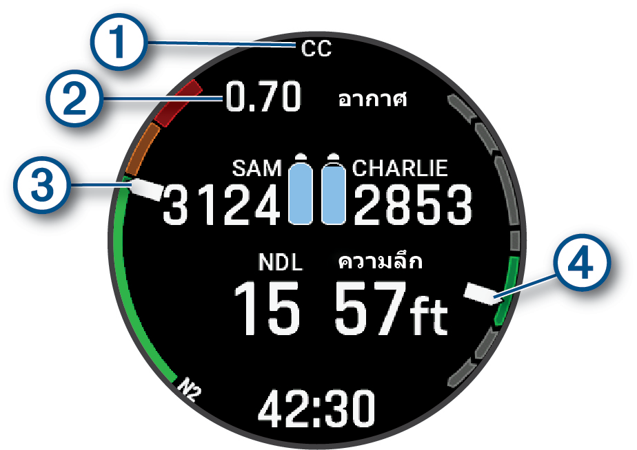 ระบุว่าการดำน้ำแบบวงจรปิด (CC) หรือวงจรเปิด (OC) ทำงานอยู่ |