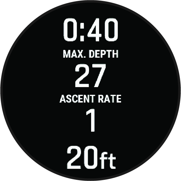 หน้าจอ in-dive สำหรับโหมด apnea และ apnea hunt จะแสดงข้อมูลเกี่ยวกับการดำน้ำปัจจุบัน ซึ่งรวมถึงเวลาที่ใช้ ความลึกสูงสุดในปัจจุบัน และอัตราการขึ้นและ DOWN คุณสามารถกด DOWN เพื่อเลื่อนดูข้อมูลเพิ่มเติมได้ในระหว่างช่วงผิวน้ำ ซึ่งรวมไปถึงความลึกในการดำน้ำล่าสุดและเวลา ดูหน้าจอแผนที่ (การดำน้ำพร้อมแผนที่) และใช้นาฬิกาจับเวลา (การใช้นาฬิกาจับเวลาดำน้ำพื้นฐาน)