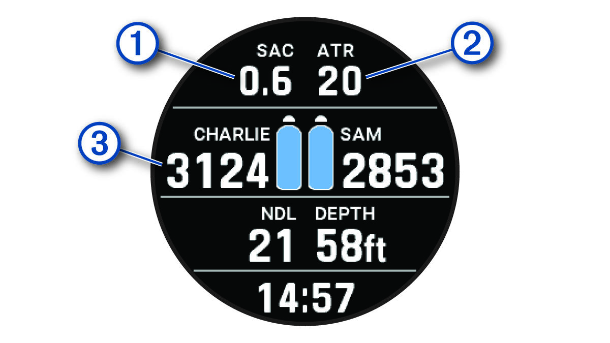 NOTE: You can customize which transmitters are displayed (Selecting Paired Transmitters to View on Your Dive Data Screens).