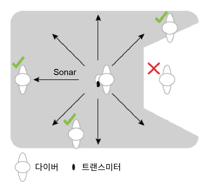 트랜스미터는 호환 다이브 컴퓨터와 무선으로 통신합니다. 수면 위에서 트랜스미터는 ANT 기술을 사용합니다. 수중에서 트랜스미터는 소나 신호를 사용합니다. 사용자의 몸, 드라이슈트, 다이브 장비는 신호 전달을 방해할 수 있으며, 특히 수중에서 그렇습니다. 최상의 신호 수신을 위하여 귀하의 그룹의 모든 트랜스미터와 다이브 컴퓨터 사이에는 방해물이 없어야 합니다. 자신의 몸 또는 장비가 신호를 차단하는 것을 방지하기 위해서는 다음과 같은 팁에 따라야 합니다.