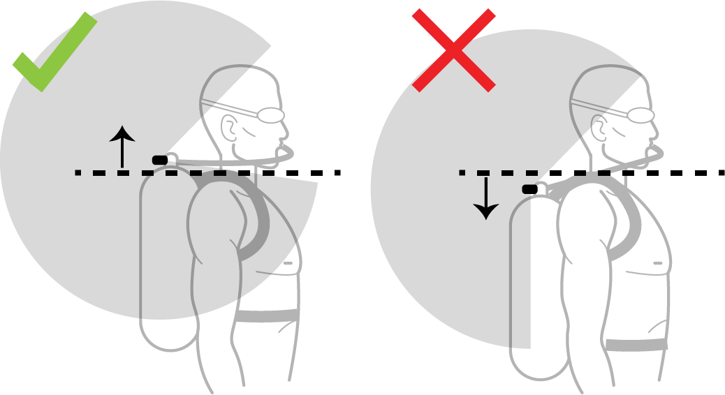 - 최상의 신호 수신을 위해서는 탱크가 등의 높은 곳에 위치하도록 착용해야 합니다. 이렇게 하면 트랜스미터가 방해받지 않고 어깨 위로 신호를 송신할 수 있습니다.