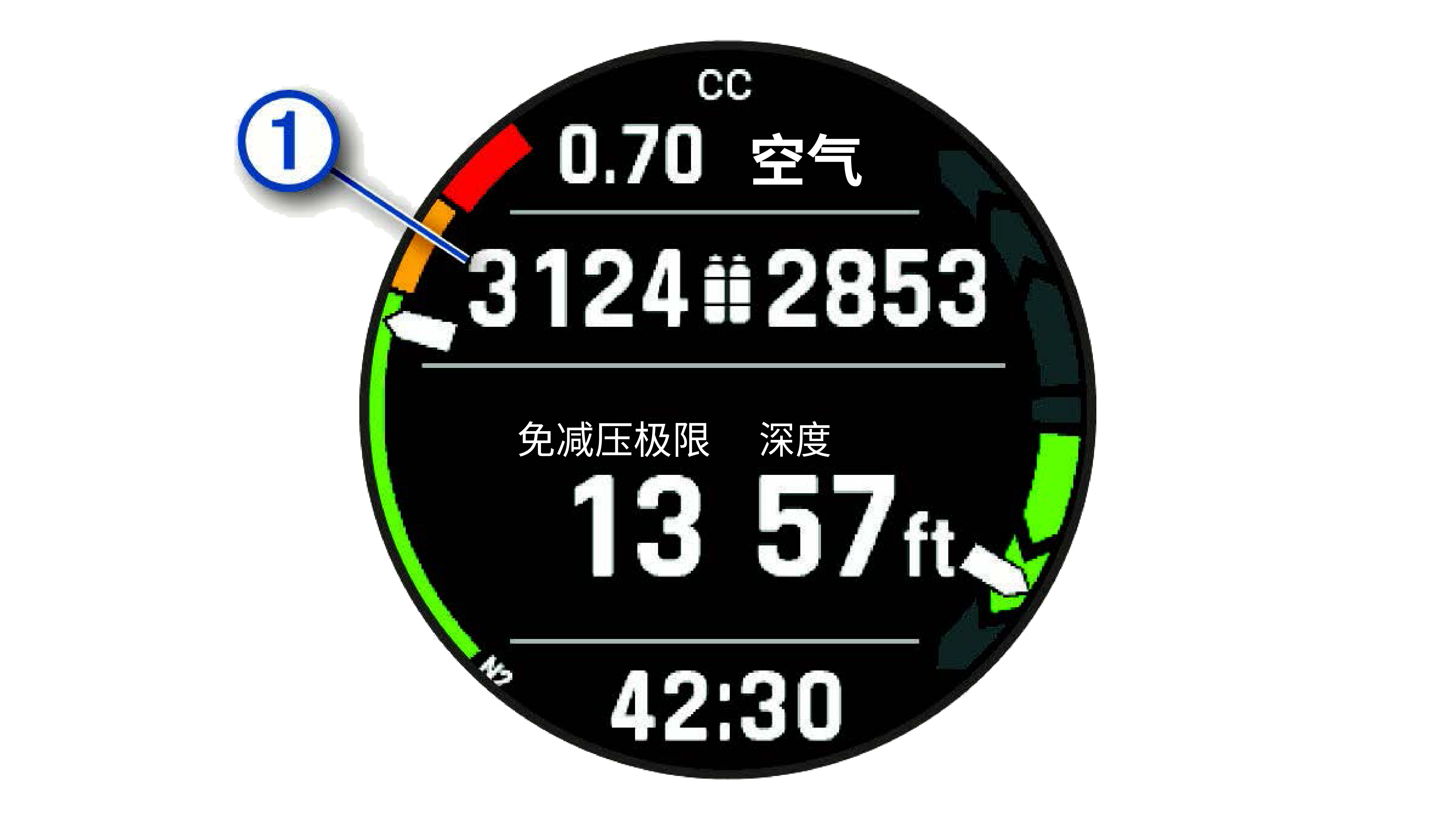 在主要潜水画面显示最多两个已配对的气瓶传感器 ① 数据(选择已配对的传感器查看潜水数据,第3页)。