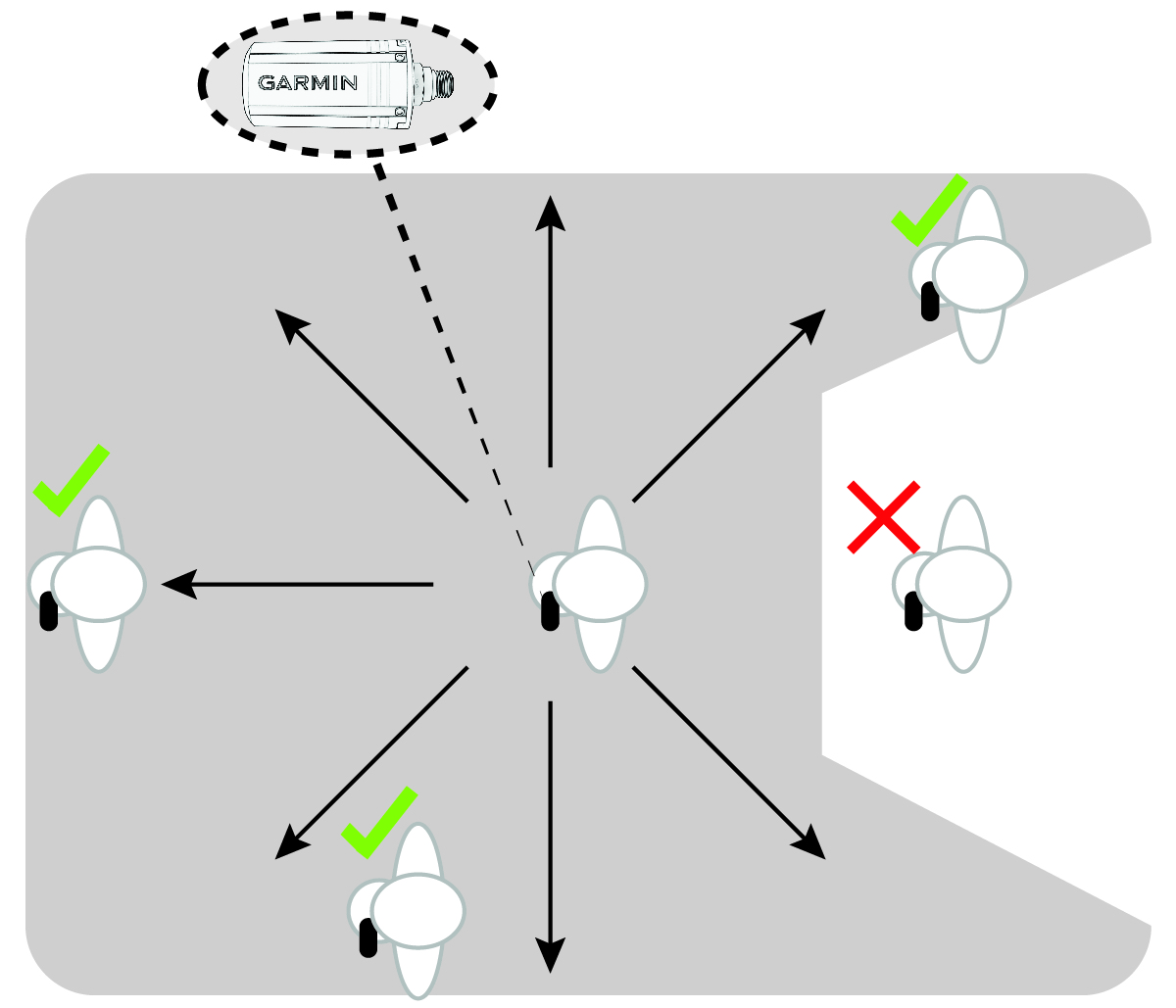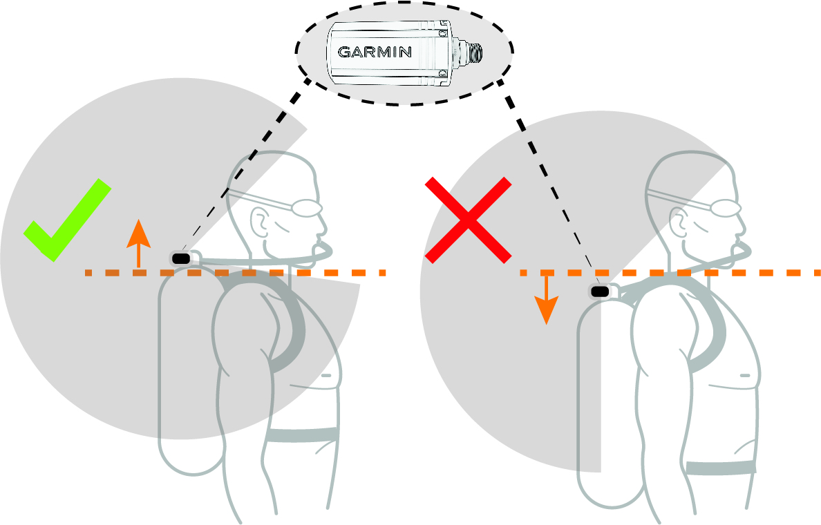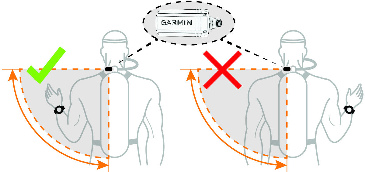 트랜스시버는 호환 워치와 무선으로 통신합니다. 수면 위에서 트랜스시버는 ANT 기술을 사용합니다. 수중에서 트랜스시버는 SubWave 소나 네트워크를 사용합니다. 사용자의 몸, 드라이슈트, 다이브 장비는 신호 전달을 방해할 수 있으며, 특히 수중에서 그렇습니다. 최상의 신호 수신을 위하여 귀하의 그룹의 모든 트랜스시버와 워치 사이에는 방해물이 없어야 합니다. 자신의 몸 또는 장비가 신호를 차단하는 것을 방지하기 위해서는 다음과 같은 팁에 따라야 합니다.