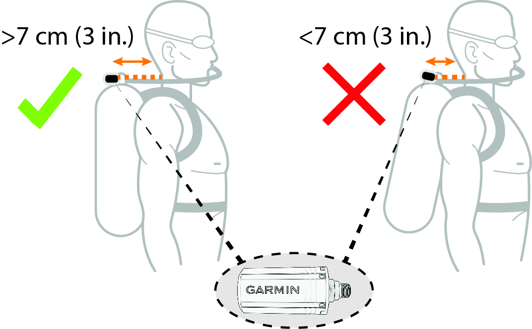- 레귤레이터가 아래에 오도록 탱크를 뒤집어 착용하는 경우, 방해받지 않고 어깨 위로 신호를 송신할 수 있도록 고압 호스를 사용하여 트랜스시버의 위치를 재조정할 수 있습니다.