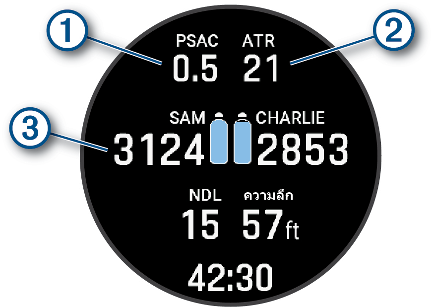 เคล็ดลับ: คุณสามารถปรับแต่งหน้าจอข้อมูลการดำน้ำเพื่อดูเครื่องรับส่งสัญญาณและข้อมูลแดชบอร์ดนักดำน้ำบนหน้าจอข้อมูลเฉพาะได้