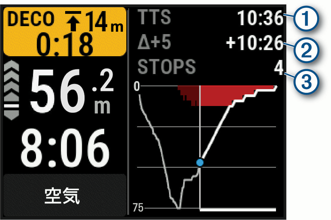 ガスダイビング中にダイナミック深度データページでこれまでの深度と水面までの浮上プランを確認できます。浮上プランには、ガスの切り替えや自動セットポイントの切り替えと、必要な減圧停止または安全停止(設定されている場合)が含まれます。