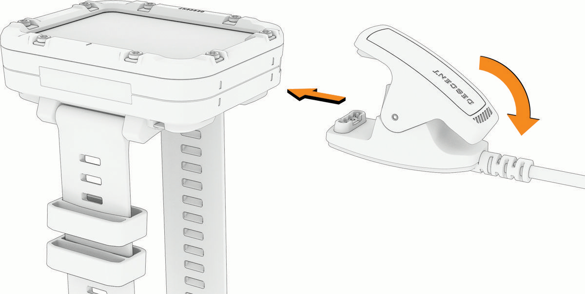 - デバイスの裏面にある端子とチャージングケーブルの電極部がしっかりと合うように、デバイスを挟みます。