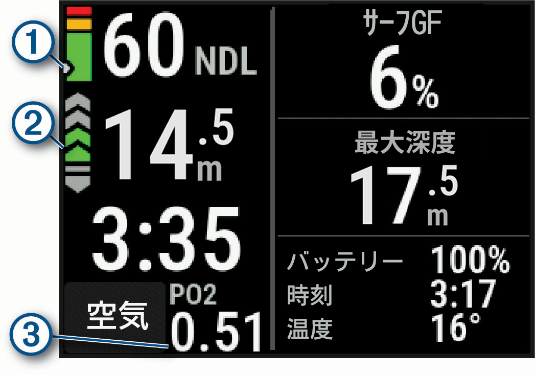 メインダイビングデータページ:メインダイブデータ項目(ガスの種類、浮上/潜降スピード、最大深度、浮上時間(TTS)、時刻、現在の温度)を表示します。NEXTキーを押してダイビングコンパス( ダイビングコンパスを使用する)を表示します。